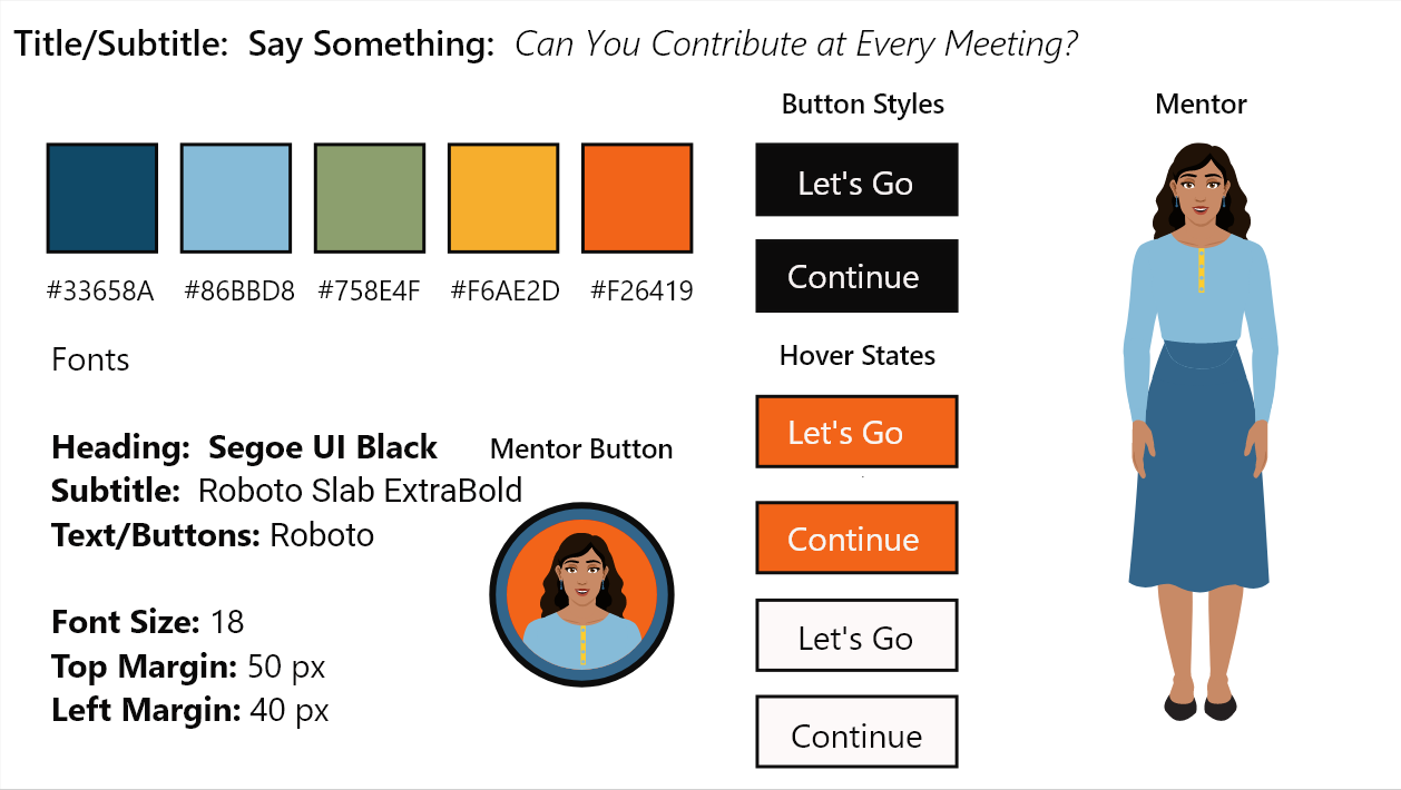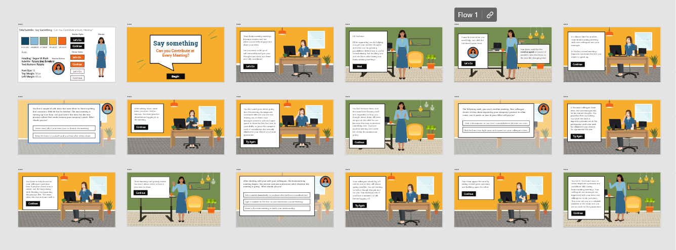 Once the action map was complete and approved, I worked to write the text-based storyboard. The text based storyboard includes immersing the learner in a story-like simulation so the learner would have opportunities to practice as if they were in a meeting. When the learner chooses the correct action, the learner receives positive feedback. When the learner chooses an incorrect answer, they have the opportunity to reflect and try again. I later added my visual mock-ups to the text-based storyboard.